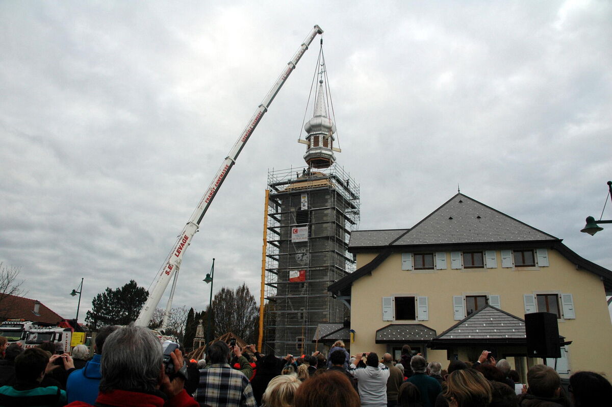 Et c’est en 2012, qu’un clocher à bulbe flambant neuf remplacera le clocher dit provisoire. Le 9 novembre 2012, la levée du clocher, étape la plus impressionnante de toutes, sera réalisée par une grue de 250 tonnes.