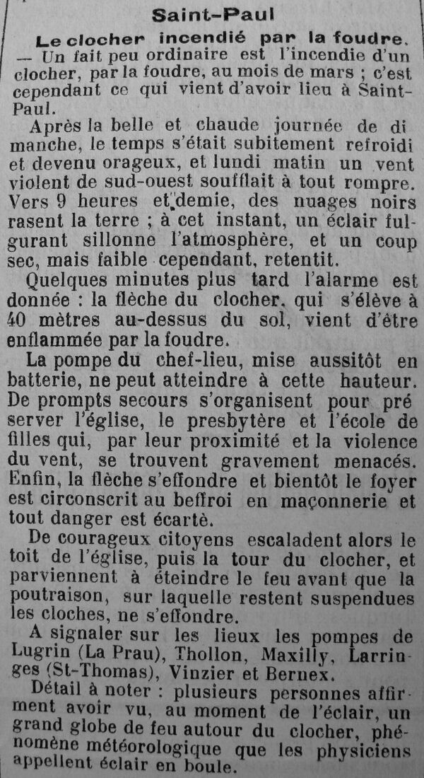 Ce jour-là, le temps n’était pas à l’orage. Personne ne s’attendait donc à ce qui allait arriver. Un seul coup de tonnerre a résonné dans le ciel, et la foudre est tombée sur la flèche du clocher de la paroisse de Saint-Paul. Un témoin racontait qu’elle s’est embrasée immédiatement. Or, le sommet du clocher était en bois, il n’a pas résisté à l’assaut des flammes, jetant la consternation parmi les paroissiens. Le feu a atteint les cloches situées dans la partie la plus basse.