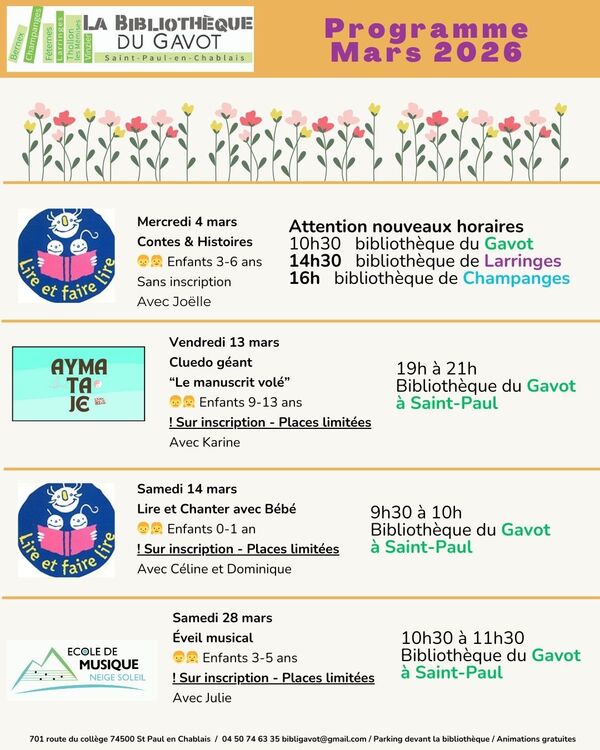 PROGRAMME DES ANIMATIONS A LA BIBLIOTHEQUE - mars 2026